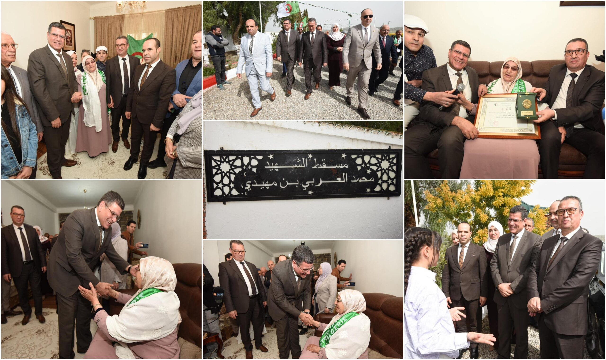 كما توجّه الوفد إلى المعلم التاريخي، مكان تواجد بيت الشهيد، وإلى المعلم التذكاري المخلّد لذكراه. وبعد الاستماع إلى النشيد الوطني، تم وضع باقة من الزهور بالمعلم التذكاري من طرف الوفد الوزاري والسلطات المحلية، ترحّمًا على روح الشهيد الرمز محمد العربي بن مهيدي