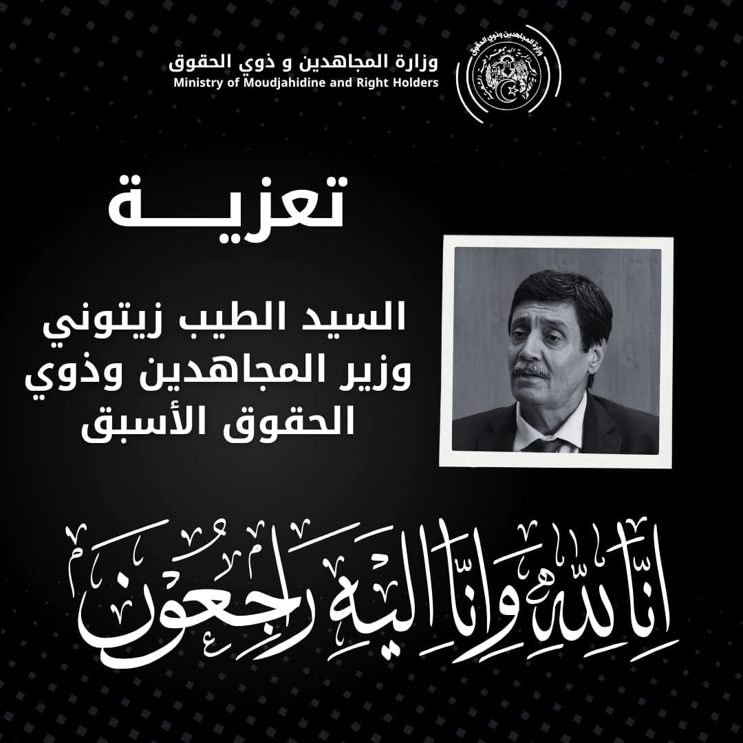 بقلوبٍ مؤمنةٍ بقضاء الله وقدره، وببالغ الحزن والأسى، يتقدّم السيد عبد المالك تاشريفت، وزير المجاهدين وذوي الحقوق، باسمه الخاص وباسم كافة إطارات وموظفي القطاع، بأصدق عبارات التعازي والمواساة إلى أسرة الفقيد الطيب زيتوني، وزير المجاهدين الأسبق، وإلى رفاقه وأحبّته.