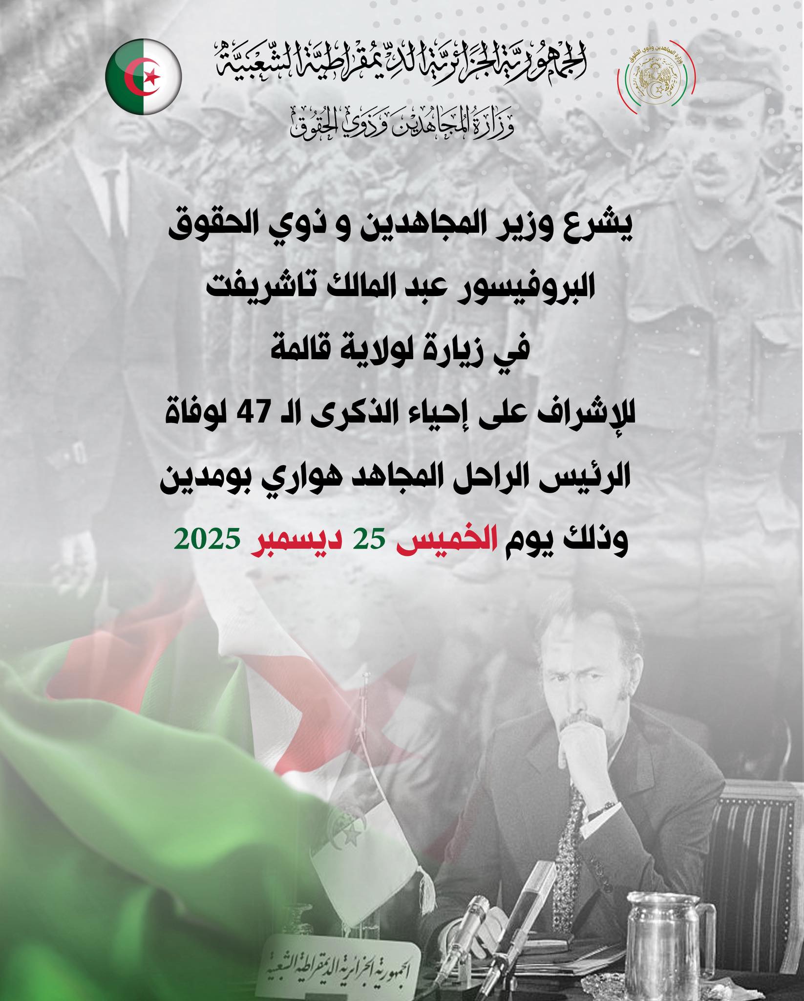 تصفّح المقالات وزير المجاهدين وذوي الحقوق في زيارة عمل إلى تلمسان: محطات رمزية وتنموية على هامش ملتقى أحمد بن بلة إحياء الذكرى الـ47 لوفاة الرئيس الراحل هواري بومدين بولاية قالمة