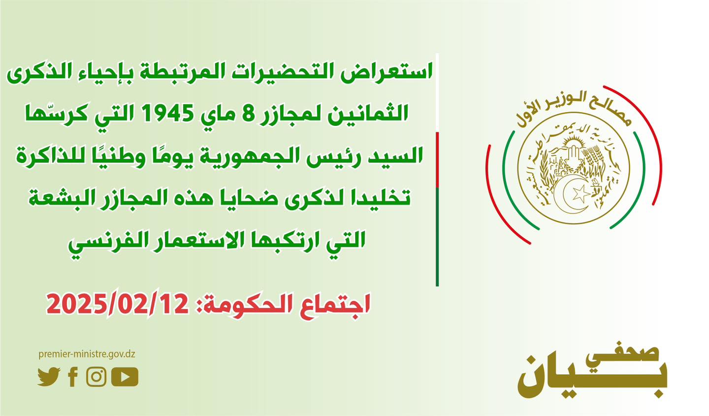 ترأس الوزير الأول، السيد نذير العرباوي، اليوم الأربعاء 12 فيفري 2025، اجتماعًا للحكومة، خصّص لاستعراض التحضيرات المرتبطة بإحياء الذكرى الثمانين (80) لمجازر 8 ماي 1945، التي كرسّها السيد رئيس الجمهورية يومًا وطنيًا للذاكرة،تخليدا لذكرى ضحايا هذه المجازر البشعة التي ارتكبها الاستعمار الفرنسي وتكريما وتمجيدا لتضحياتهم البطولية من أجل الحرية والاستقلال.