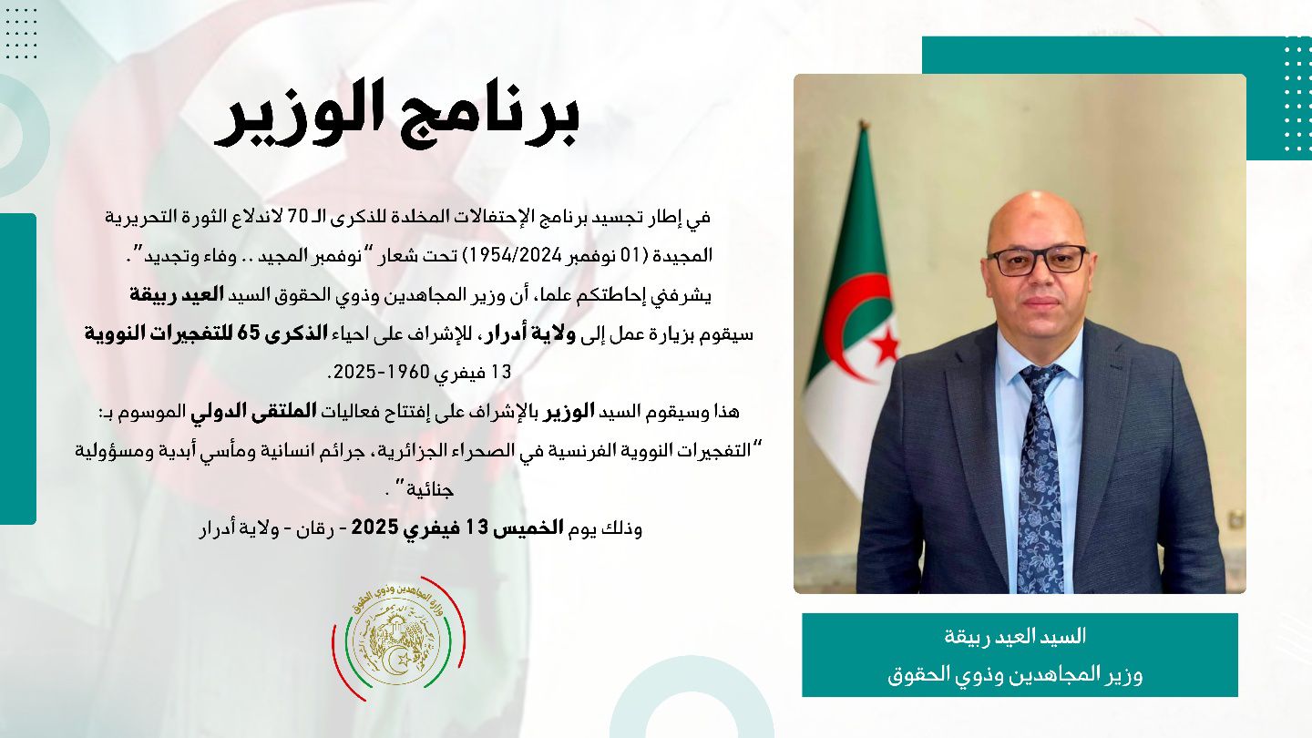 تصفّح المقالات استعراض التحضيرات المرتبطة بإحياء الذكرى الثمانين (80) لمجازر 8 ماي 1945 وضع إكليل من الزهور وقراءة فاتحة الكتاب على أرواح شهداء المنطقة بساحة الشهداء ببلدية رقان بمناسبة الذكرى 65 للتفجيرات النووية الفرنسية بالصحراء الجزائرية.