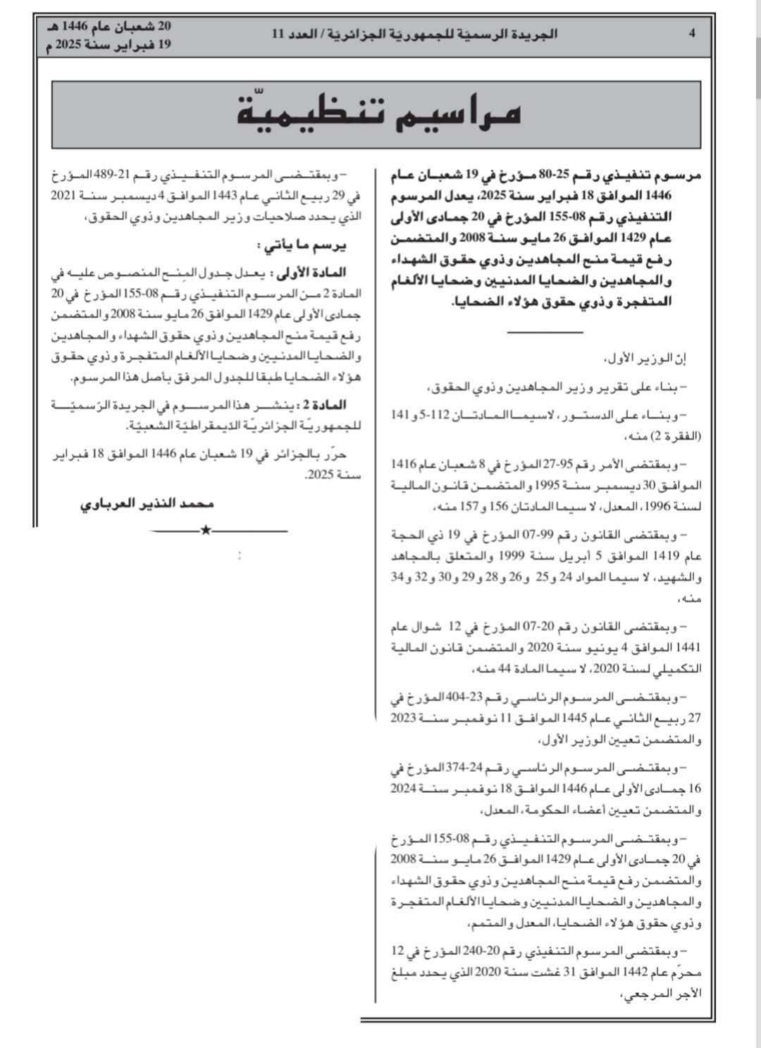 📌 إنّ رفع قيمة منح المجاهدين وذوي الحقوق التي لم تعرف المراجعة منذ أكثر من 13 سنة، يأتي أيضا في إطار تنفيذ ماجاء به الدستور في مادته الثمانين (80) منه التي تنص على ضمان الدولة “احترام رموز الثورة، وأرواح الشهداء وكرامة ذويهم والمجاهدين”، باعتبارهم من بين معالم الذاكرة الوطنية.